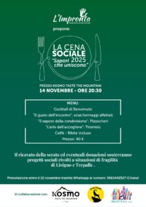La Cooperativa Sociale L’impronta in collaborazione con il ristorante KOSMO e la GIOVENTU di Trepalle propone una serata di condivisione inerente alle attività svolte e per sostenere progetti e iniziative che offrano sorrisi, inclusione e sollievo alle famiglie durante il nuovo anno. (A seguire locandina dell'evento)